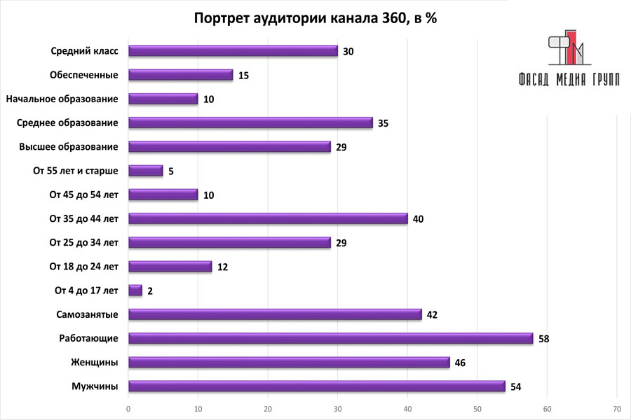 Профиль аудитории: 70% аудитории канала составляет финансово активное население, интересующееся жизнью столицы и Подмосковья. По демографическому признаку аудитория канала «360°» делится следующим образом: 46% женщины, 54% мужчины. Процент постоянных зрителей канала повышается за счет ведения круглосуточного вещания, принимаемого на всей территории столицы и Подмосковья.