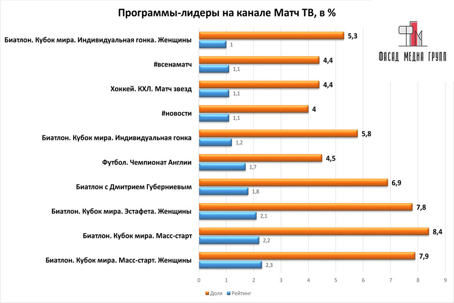 Только хоккей (3 матча) и биатлон (2 гонки). Вместе с тем телеканал «Матч ТВ» обладает неплохими рейтингами телесмотрения в стране. Безусловно, ему тяжело тягаться с такими титанами отечественного медиарынка как: «Первый канал», «Россия 1», «НТВ», «ТНТ», «СТС». Однако не стоит забывать, что телеканал имеет узкую тематику вещания – спорт. Следовательно, среди всех каналов, которые транслируют спорт в стране, «Матч ТВ» – это несомненный лидер.